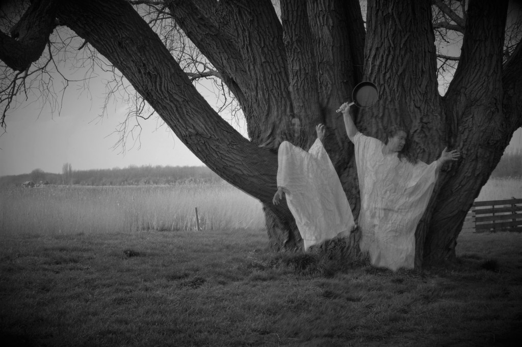 For this picture I invited two of my neighbours, both women with a girlpower attitude, who are also sometimes seen outside of their household, even at midnight! We rode our bicycle to Noorddijk, where an old willowtree grows along the pathway to Groningen. This is the exact spot where we think the farmhand saw the witte wyven!