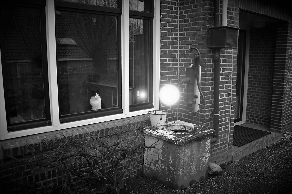 Where to find a well in the neighbourhood? A search an google maps did not provide any well at all. I was a bit in a pickle, until I asked my daughters. One of them told me that around the corner of our house, where her friend lives, one can find a nice old well! The house cat was so kind to sit in the window sill, so that I could finish the picture.