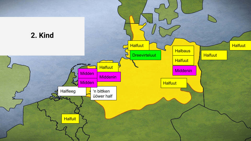 The second child is often called halvuut (halfway), but there is also the variation middenin (midway), which is, next to what is displayed on this map, also found in Norway (see Warren Roberts’ book Norwegian Folktale Studies: Some Aspects of Distribution (1964), p. 16). And, quite interesting for this distribution, also in Belgium.