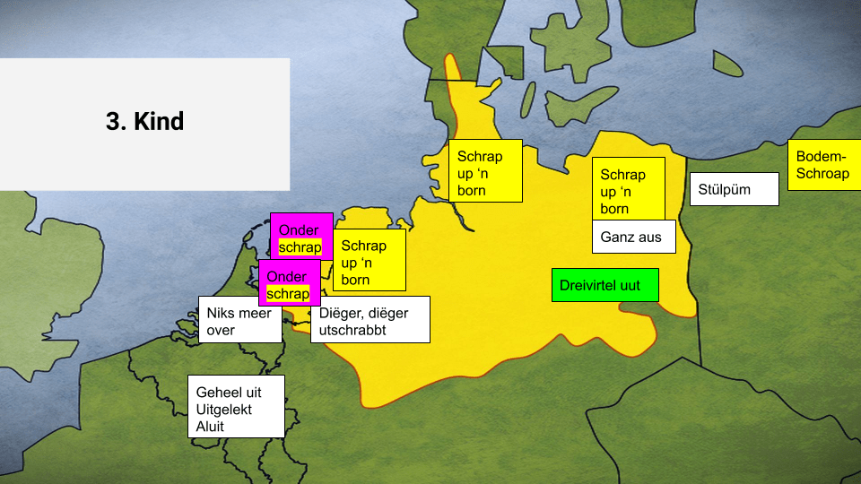 Good, as et noch neet öäverdüdlik is: nåmen van kinder givt de kwantityt an butter in et vat an. Eyrsten kind heit hyr en goden anfang, dår vos sik net wat van top van vat afstreiked hev. Tweyden kind heit dan en bitken öäver halv, dår ungevär hälvte et vat uut is. Lesten kind heit dan deeper, deeper uutskråped, dår of vos eyglyks bodem råkt med syn klauwen.