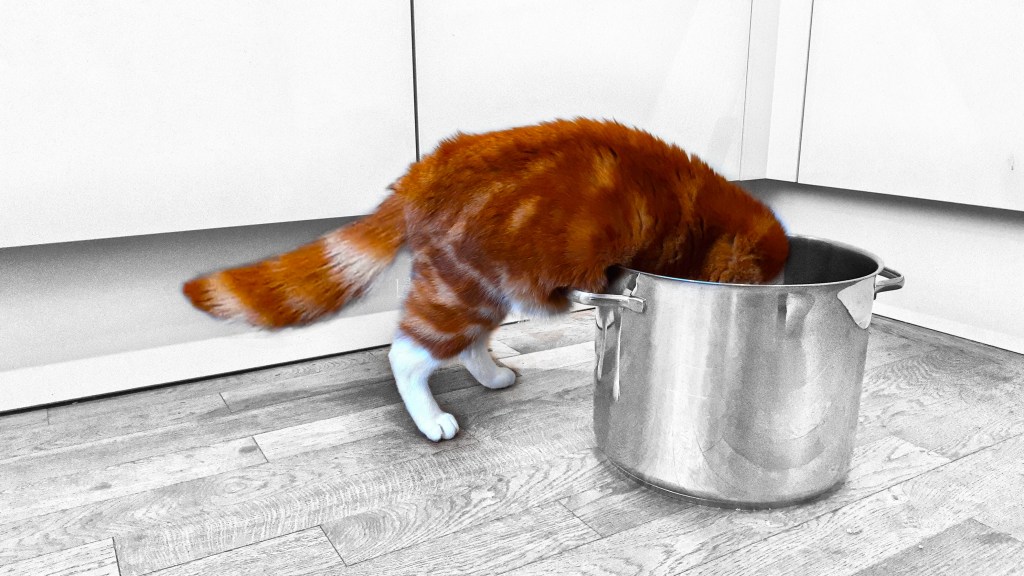 Because of lacking a fox or a wolf, I put Otis the cat on the photo. We put some salmon paste, which the cat adores, on the bottom of the pan. When the pictures were finished Otis came to me for more pictures, because he already knew that, with more pictures, there would be more salmon paste!
